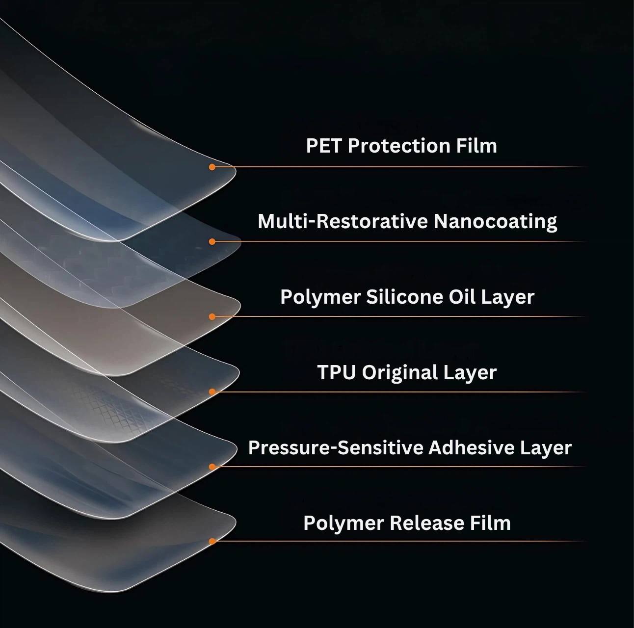 RoyMc PPF is engineered with a multi-layer structure including a PET protection film, self-healing nanocoating, silicone oil layer, aliphatic TPU base, pressure-sensitive adhesive, and a polymer release liner—each selected to deliver lasting clarity, flexibility, UV resistance, and superior surface protection in real-world conditions.